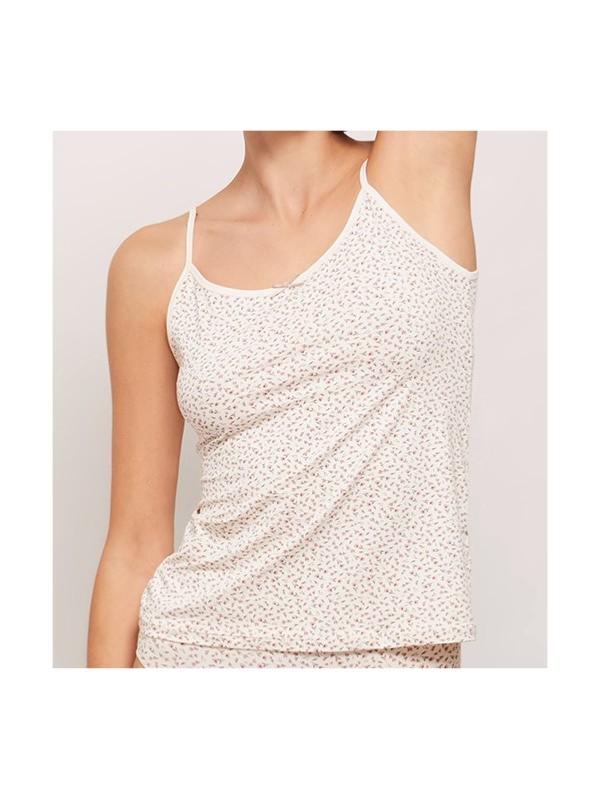 Collection "70073" caraco en tissu polyamide souple et doux imprimé floral sur fond rose, bretelles fines.