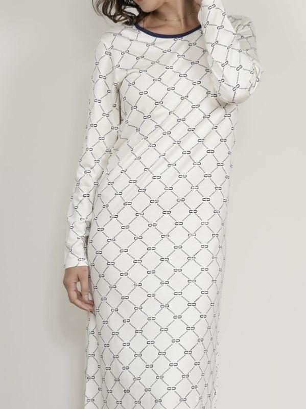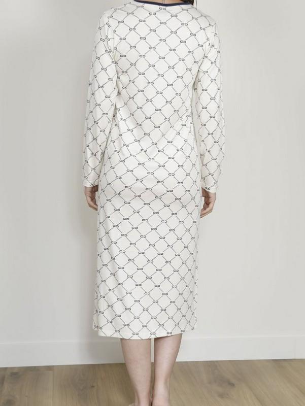 Collection "Penny" chemise de nuit en tissu mélangé coton viscose imprimé chainette bleu sur fond crème, encolure ronde rehaussé d'un biais bleu, poche poitrine décorative, fente de chaque côté dans le bas.