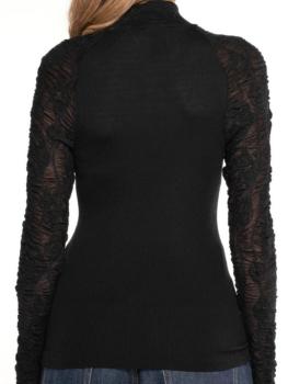 Le pull est col cheminée uni noir avec un beau travaillé sur les manches transparentes en tissu gaufré façon dentelle ce qui offre allure et simplicité.