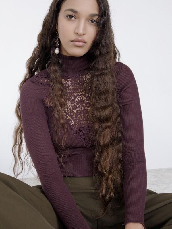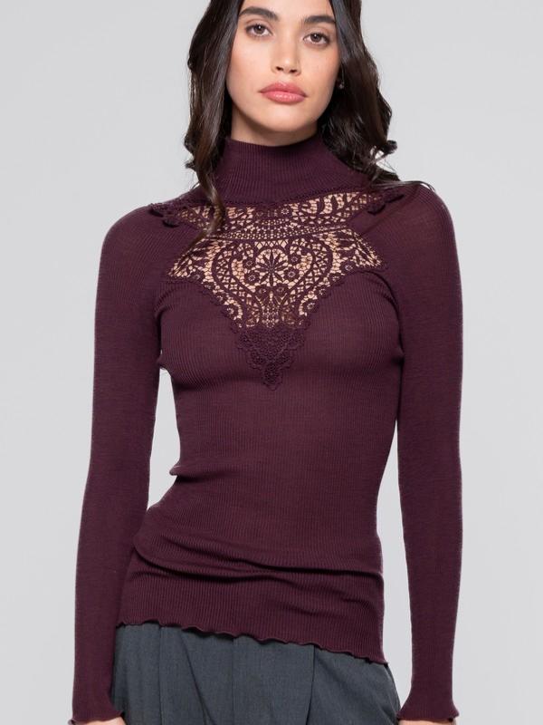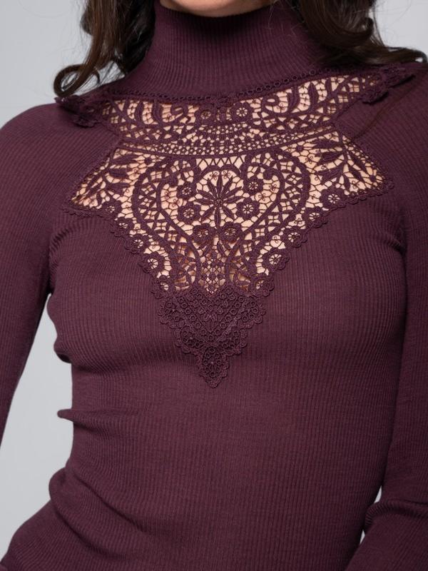 Très chic avec son col roulé agrémenté d'un très large et luxueux empiècement de guipure ton sur ton qui se positionne parfaitement sur le décolleté.