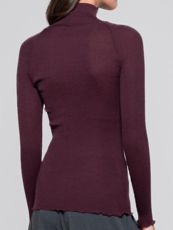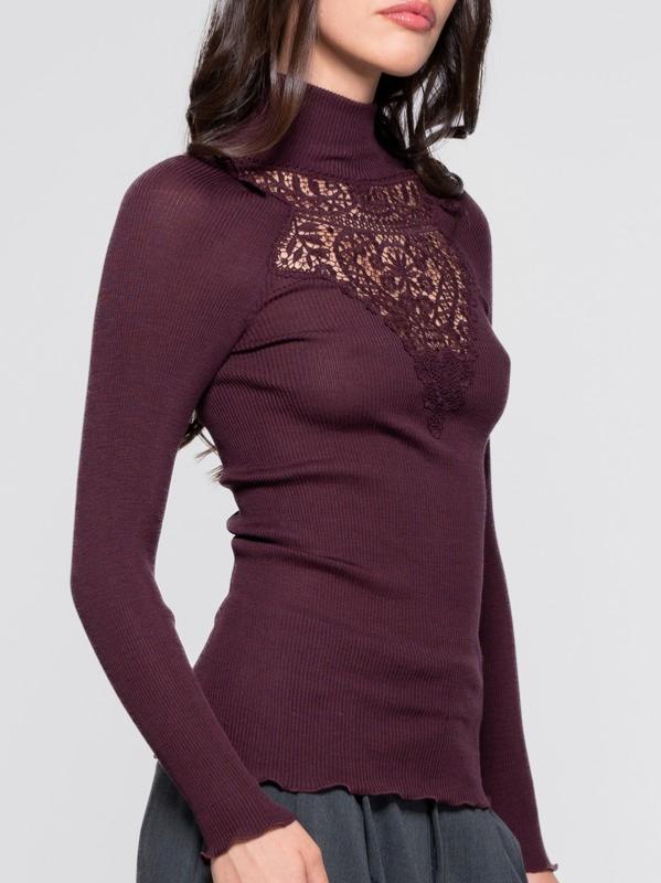 Collection "7608" pull laine et soie maille plissée avec col roulé et décolleté agrémenté d'un large et luxueux empiècement de guipure, le tout coloris cherry.