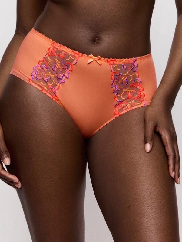 Le modèle est coloris orange vif avec large empiècement de tulle brodé floral multicolore de chaque côté à l'avant. Arrière en maille uni et fond doublé coton.