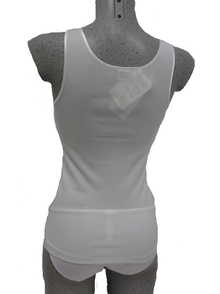 Modèle de débardeur en coton uni blanc. 100% fil d'écosse. Les bretelles sont gansées de satin ainsi que le décolleté en V. Ce modèle est un basique de la collection permanente Oscalito. Léger et peu épais il se porte en guise sous-vêtement. Dans la même gamme existe le caraco et le tee-shirt manches courtes.