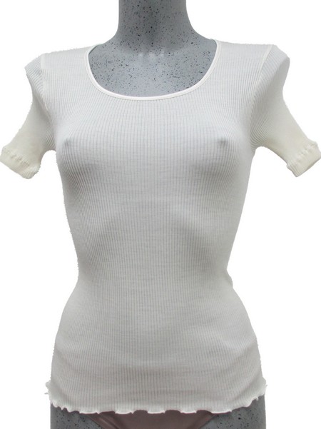Modèle de tee-shirt en laine et soie à manches courtes uni en maille plissée avec encolure de forme ronde et finition bord satin de la même couleur que le modèle. Il sera parfait en sous-vêtement pour un hiver au chaud mais pourra aussi se porter sous une veste en toute discrétion.