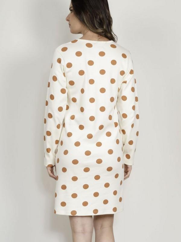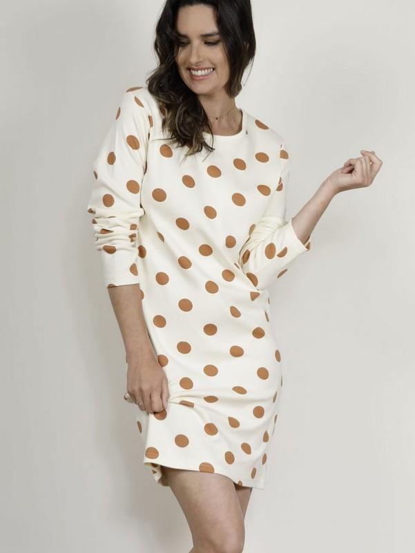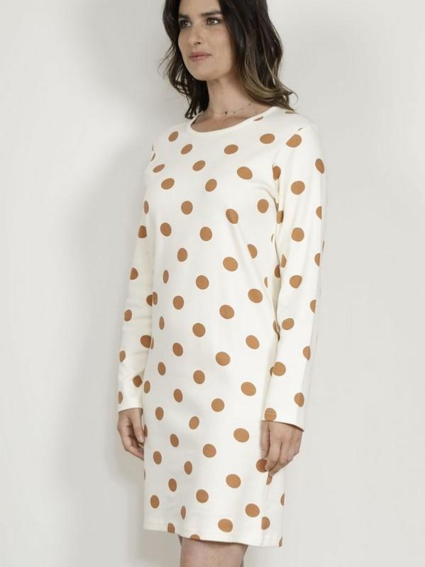 Collection "Pascale" liquette de nuit femme manches longues et col rond en tissu coton interlock orné de maxi pois marron sur fond crème.