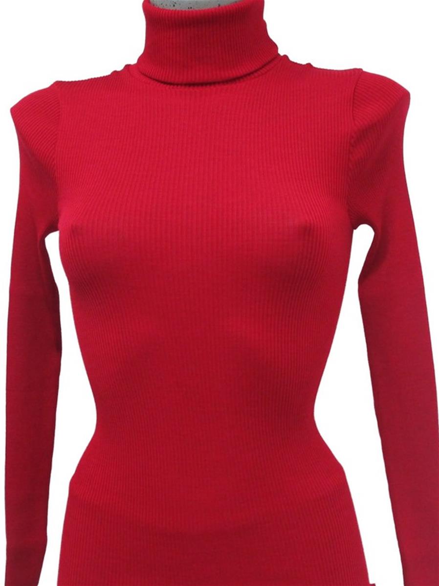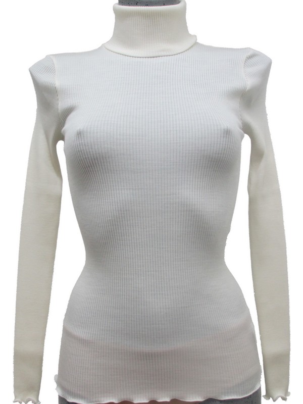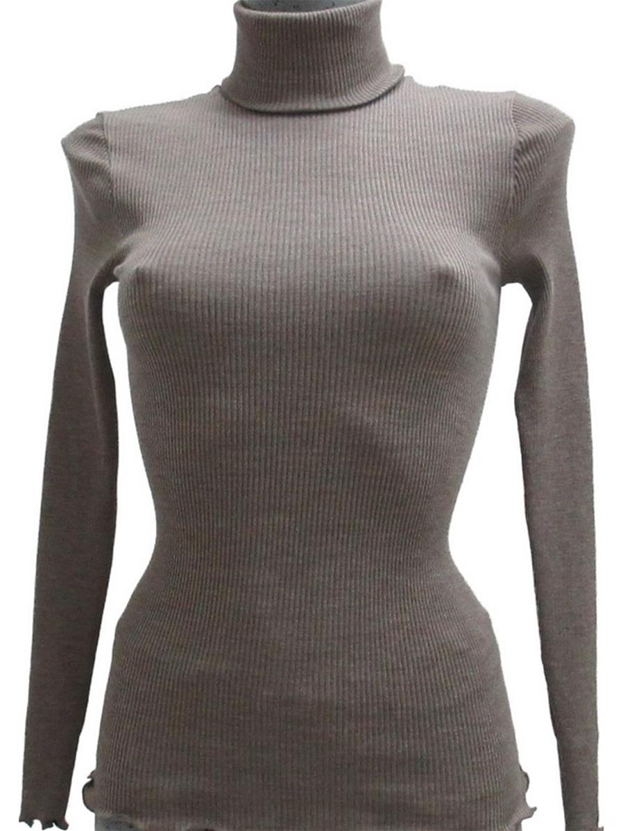 Modèle de tee-shirt manches longues en laine & soie, maille plissée uni avec col forme roulé sans aucun motif ni fantaisie.