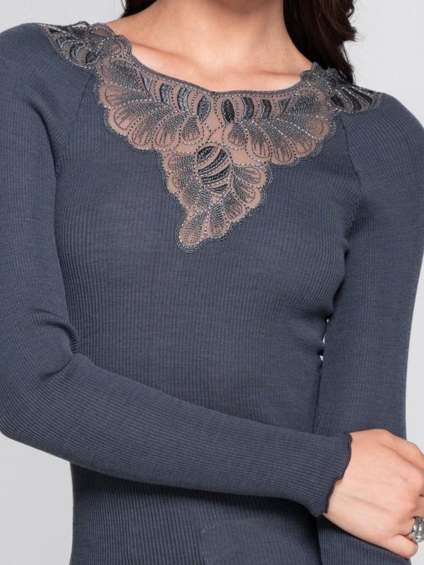 Collection "7618" pull manches longues en laine et soie avec large empiècement de tulle brodé sur le décolleté ton sur ton gris tempête.