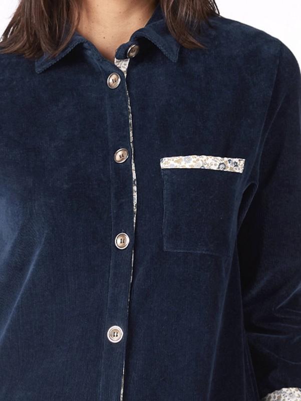 On note des finitions soignées en tissu liberty notamment en bout de manche que peuvent se porter avec revers laissant apparaitre cet imprimé chic un brin rétro.