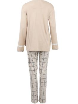 Modèle de pyjama jambes et manches longues de la collection hiver London de la marque de lingerie de nuit Canat. Il se compose d'une veste boutonnée sur toute la longueur unie camel avec poche poitrine sur le côté gauche orné d'un biais brodé que l'on retrouve aussi sur le bas des manches. Petite fente de chaque côté pour une touche de modernité. Le pantalon est travaillé en tissu imprimé tartan dans les mêmes tons que le haut avec taille élastique et coupe droite. Douceur et élégance sont au rendez-vous avec ce pyjama chic et sobre.