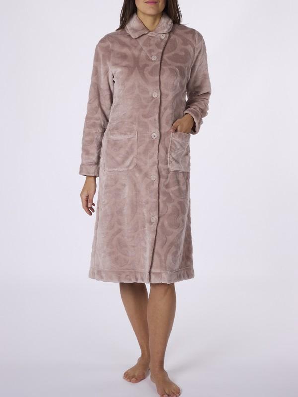Collection "Goya" robe de chambre boutonnée en tissu polaire texturé beige avec col chemisier et poche plaquée de chaque côté.