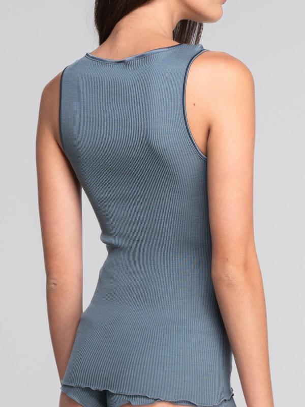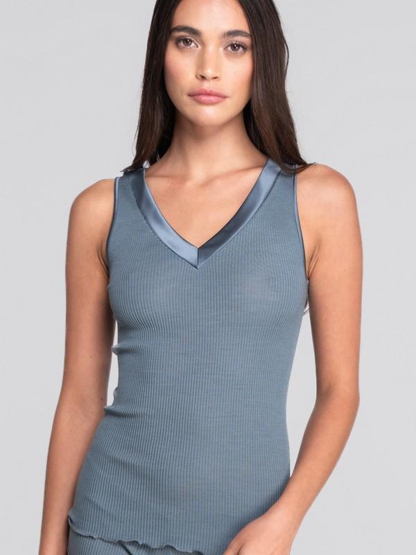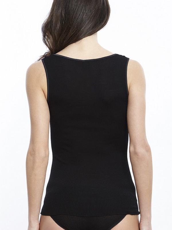 Modèle de tee-shirt sans manches en laine et soie maille plissée de la marque italienne Oscalito. Travaillé ici en coloris noir et nude avec décolleté forme V rehaussé d'une large bande de tissu satiné ton sur ton qui confère au modèle élégance et sobriété. Les finitions sont toujours aussi soignées grâce au bord satin qui entoure les bras et l'arrière du col. Idéal pour porter l'hiver sous les vêtements ou laisser entrevoir la bande de satin sous veste ou chemise.