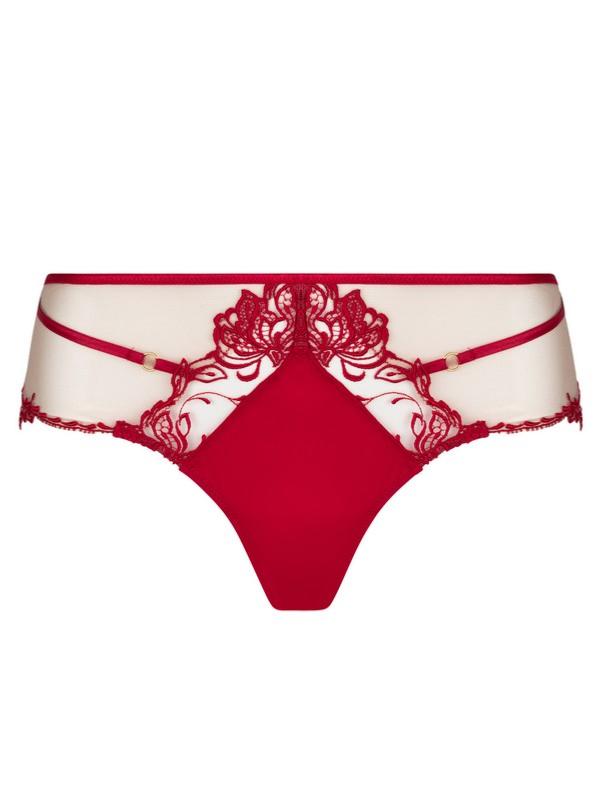 Le modèle travaillé avec broderie florale rouge sur fond nude voit un jeu de liens enrichis de petits anneaux dorés à l'avant et empiècement de maille satinée opaque.