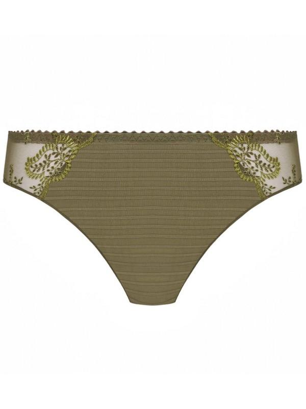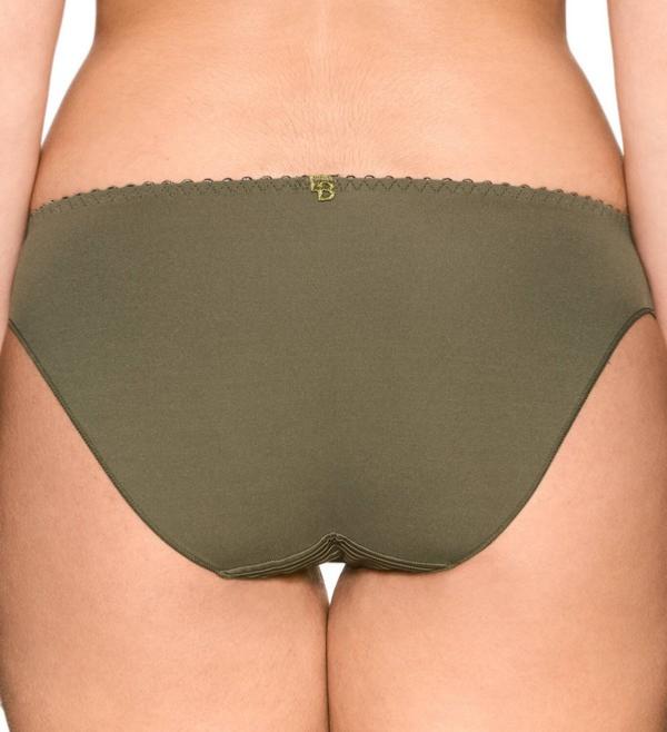 Modèle de slip forme brésilien collection Elise de la marque de lingerie Louisa Bracq travaillé en vert Olive.