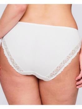 Collection "Salerno" slip forme brésilien classique en maille microfibre douce, lisse et opaque avec empiècement de dentelle stretch et finitions festonnées, doublé 100% coton.