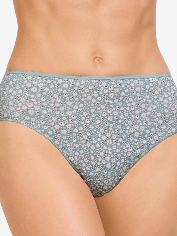 Collection "32072" lot de 2 slips en tissu coton imprimé de petites fleurs blanches sur fond vert, logo cousu en lettre brodée, fond doublé tissu coton.