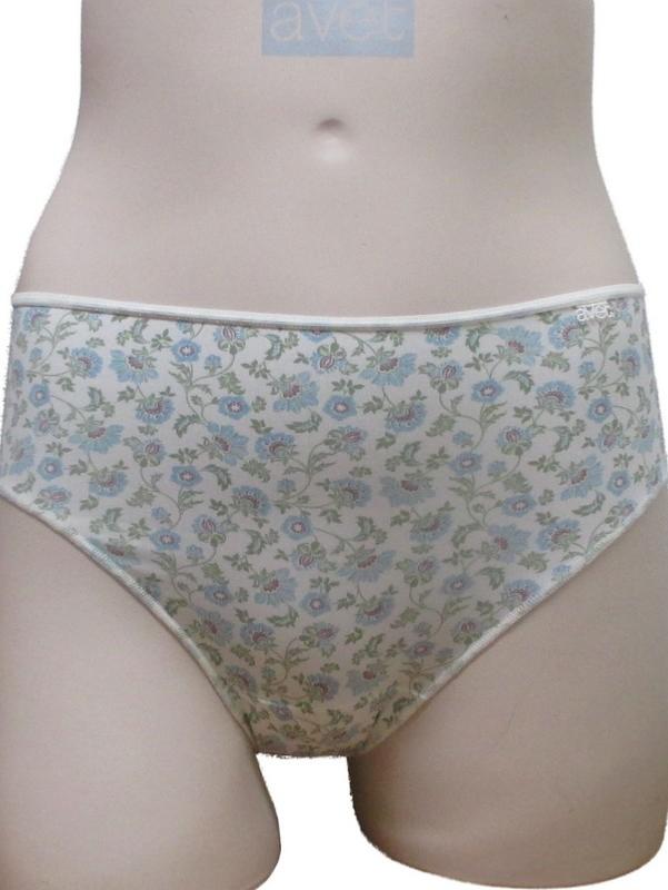 Collection "32085" slip en tissu polyamide imprimé petites fleurs bleues et vertes sur fond ivoire avec fine taille élastique et doublé de tissu éponge.