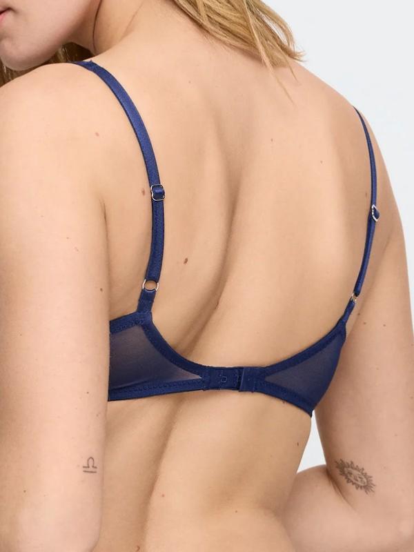 Le modèle est travaillé en coloris uni bleu profond avec bonnets à coques fines et coussinets amovibles le tout recouvert de dentelle.
