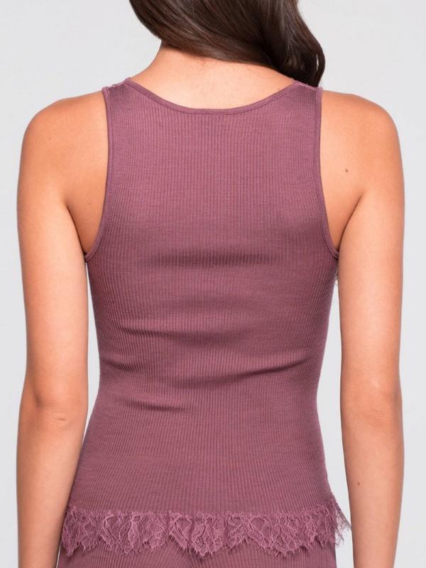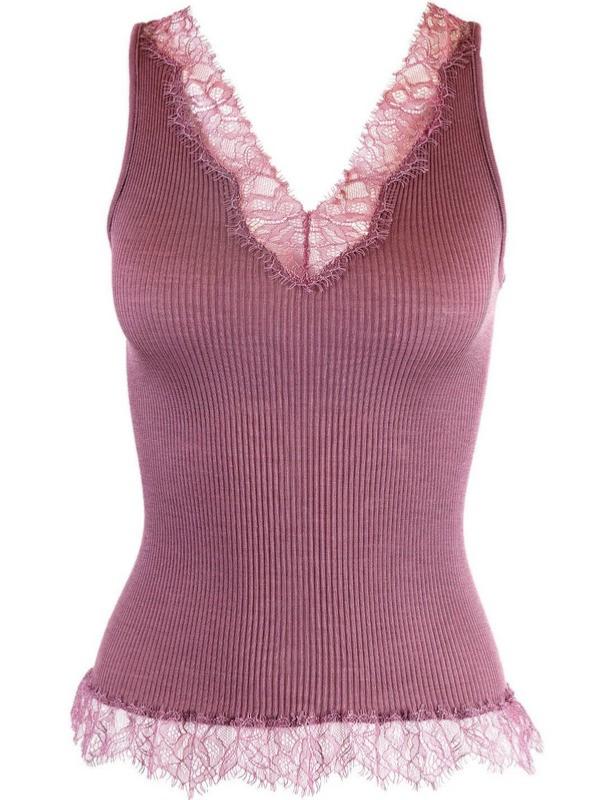 Collection "7642" top sans manches en laine et soie maille plissée avec encolure en V rehaussé d'une délicate dentelle chantilly que l'on retrouve aussi dans le bas du modèle le tout dans un très doux rose Agata.