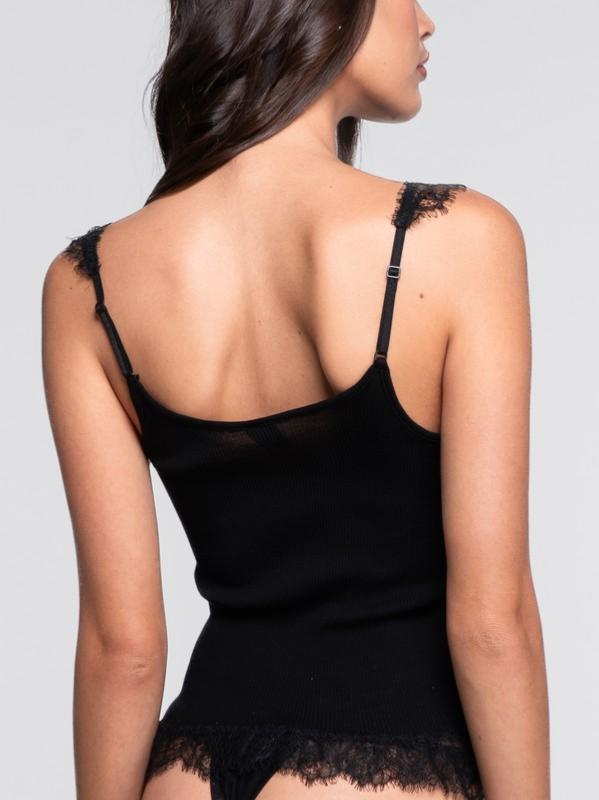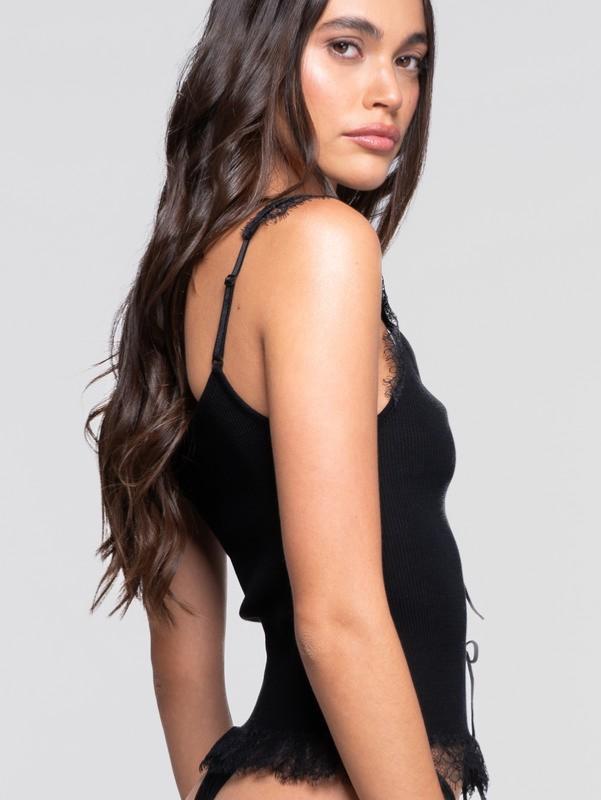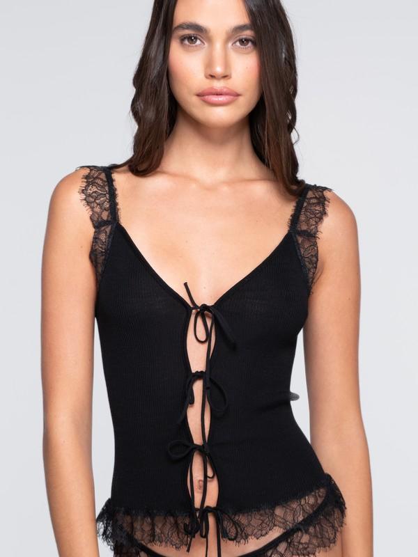 Collection "7640" top en laine et maille plissée avec bretelles fines rehaussées de dentelle, laçage ajouré à l'avant et dentelle volanté dans le bas du modèle.